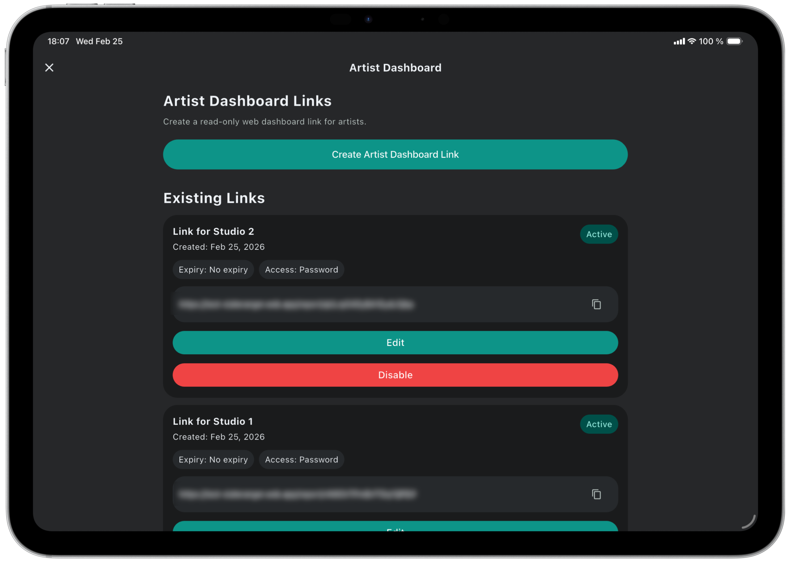 This section provides an overview of all existing links, allowing you to see which ones are active and currently shared with artists.