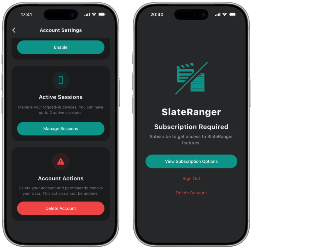 iOS: Swipe down the Paywall to see the screen “Subscription Required” and click “Delete Account”.